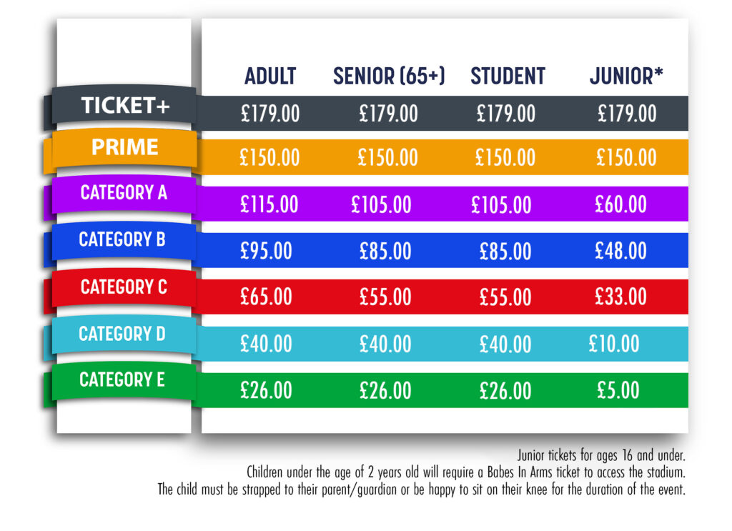 Children under the age of 2 years old will require a Babes In Arms ticket to access the stadium. The child must be strapped to their parent/guardian or be happy to sit on their knee for the duration of the event.